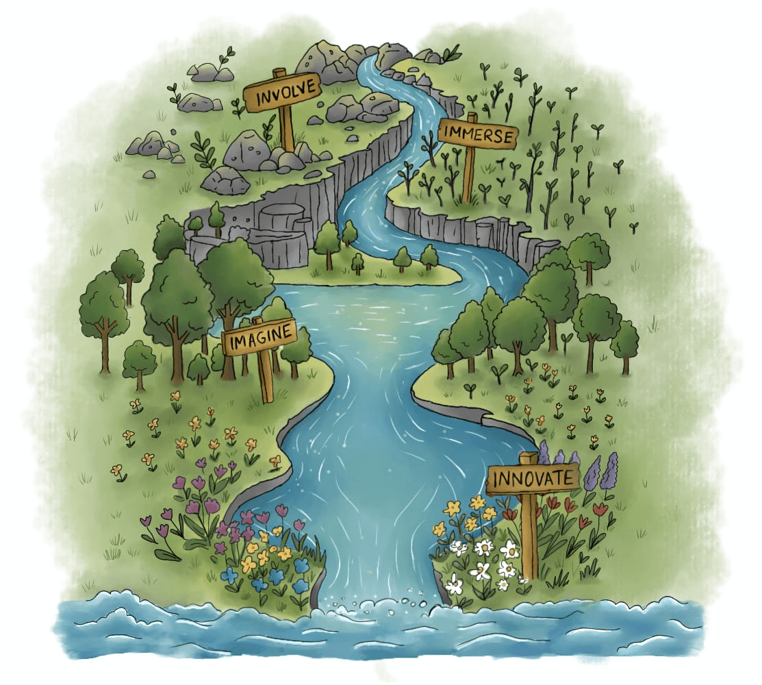 In these workshops, our learners interact with citizens, work closely with mentors, and craft solutions to address specific justice issues. The above image illustrates our workshop journey through four transformative stages: Involve, Immerse, Imagine, and Innovate.